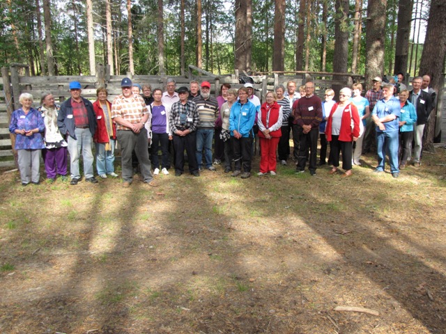 Seuran puheenjohtajan valtikka siirtyi Sirkka-Liisa Fredrikssonilta Antti Varvulle. Kuvassa entinen ja uusi puheenjohtaja poseeraavat Kärkkään poroerotusaitaa vasten rinnan, Sirkka neljäntenä vasemmalta ja Antti viidentenä ruutupaidassaan.